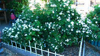 | The other once blooming rambler. It gets a yearly haircut. | Darlow's Enigma . The container is 8x8 feet. |